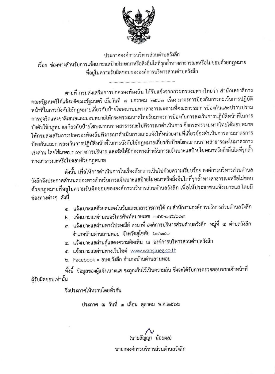 ช่องทางสำหรับการแจ้งเบาะแสป้ายโฆษณาหรือสิ่งอื่นใดที่รุกล้ำทางสาธารณะหรือไม่ชอบด้วยกฎหมายที่อยู่ในความรับผิดชอบขององค์การบริหารส่วนตำบลวังลึก